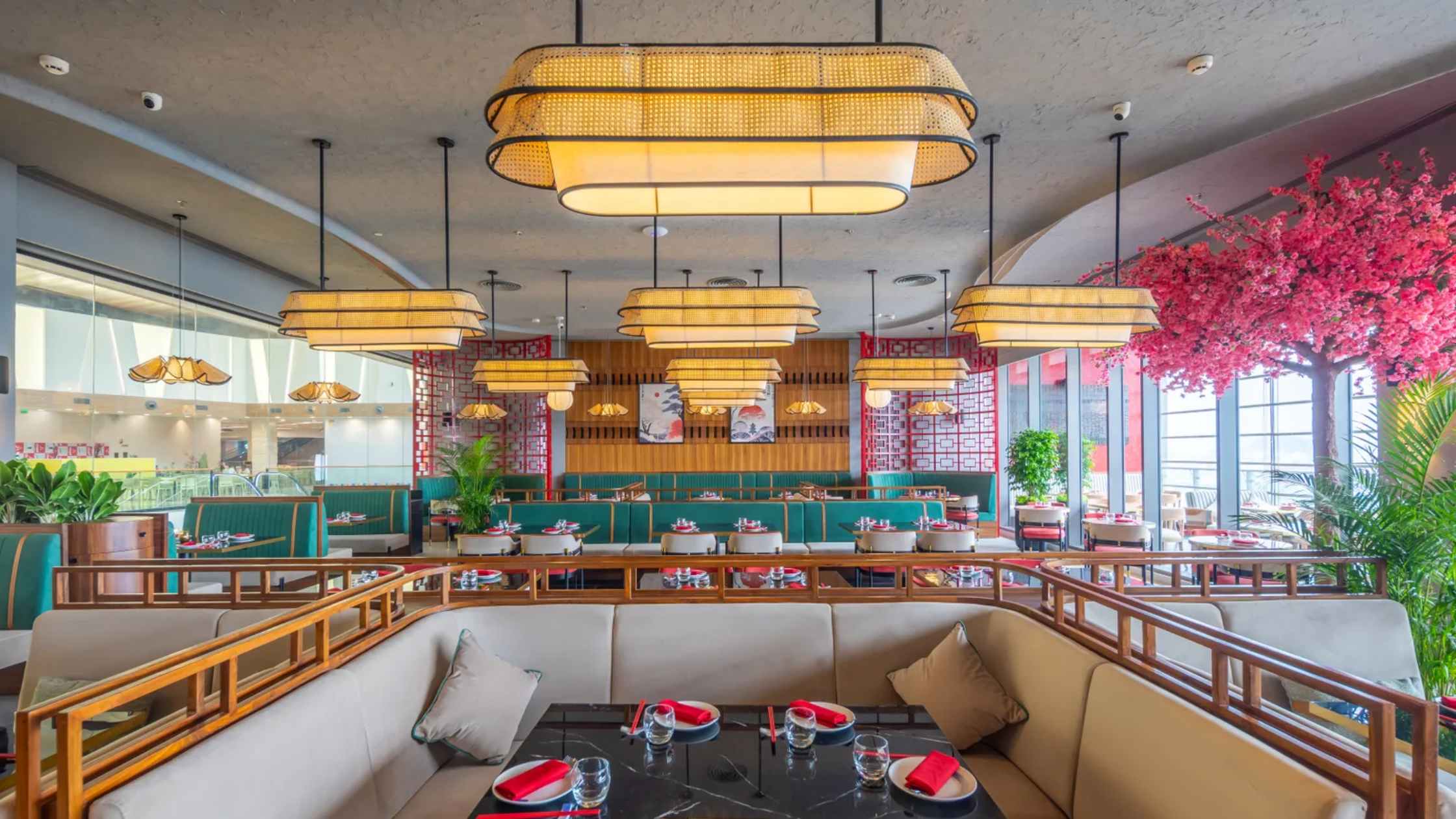 Among Hyderabad’s new dining spots, Foo stands out with its breezy and inviting atmosphere, highlighted by faux cherry blossom trees and pod-style seating. Designed by Sarah Sham, the restaurant features charming bento box-inspired flooring and pendant lights made from natural cane, adding elegance to the contemporary space.