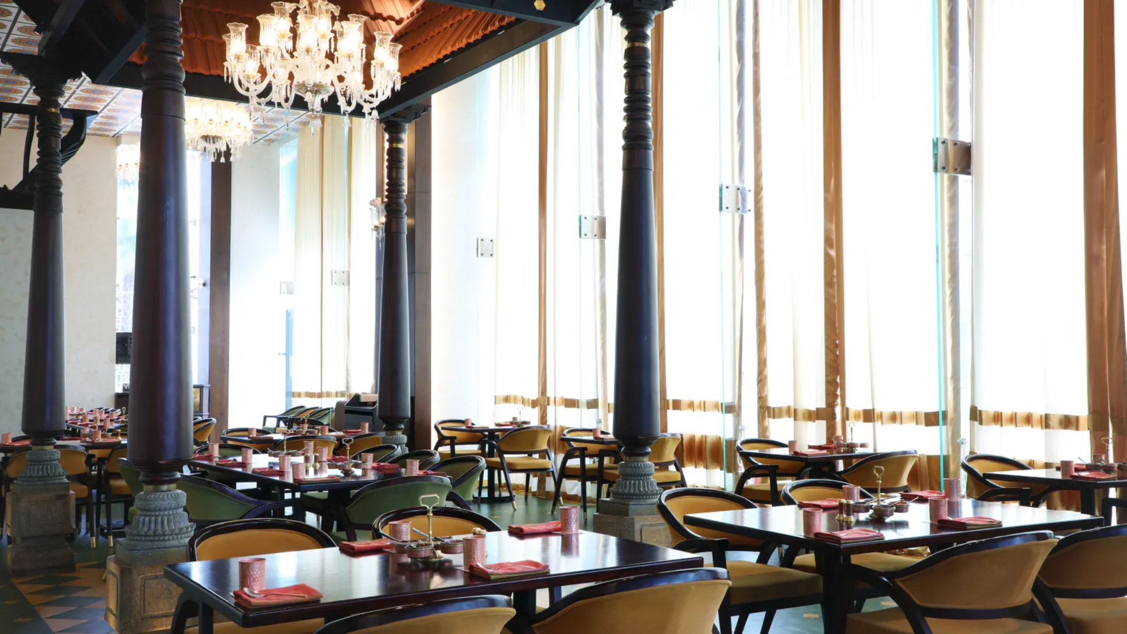 At Simply South, diners are transported to a grand Chettinad home in Tamil Nadu, right in Hyderabad. The restaurant features a courtyard-themed design with imposing wooden pillars, a sloping roof, and stunning antique glass chandeliers that cast a flattering light. Gold-bordered curtains reminiscent of the Kerala kesav saree and mundu drape the floor-to-ceiling glass walls, allowing natural light to infuse the space with a dynamic sense of movement and texture.